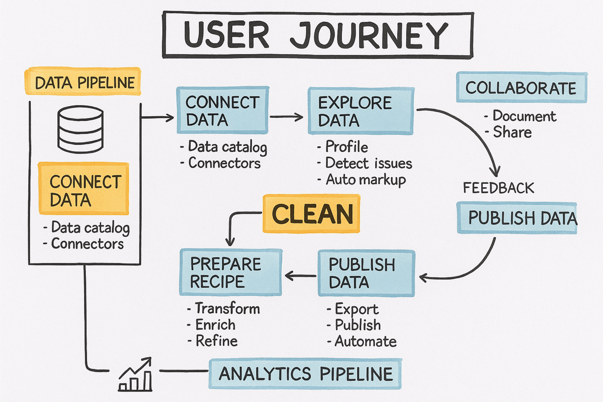 - Unified data prep flows into a drag-and-drop pipeline interface